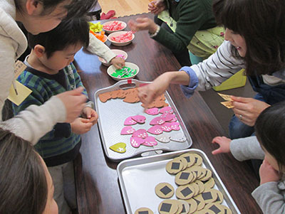 ぱんだくらぶのお友達やおうちの人と一緒に作って準備した品物が並びます。フランクフルトやさん、スイーツやさん、アクセサリーやさん、古着やさんに福引やさんと、お店もたくさん。今日はぺんぎんタイムのお友達が買い物に来るので、前半はぱんだくらぶのお友達がおうちの人と一緒に売り子さんです。「いらっしゃいませ♪」「ありがとうございました♪」など可愛い声が飛びかいます。ぺんぎんタイムのお友達が帰り、後半はぱんだくらぶのみんなでお買いものタイム♪。エコバッグいっぱいに楽しくお買い物をしたみんなの笑顔がとてもキラキラしていました。
