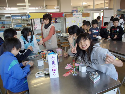 その後は三角万華鏡・六角小箱・ペン立てなどの中から好きな工作を選んで作ったり、遊びのコーナーを楽しみました。前回も好評だった“つむつむタワー”で自分の記録を更新して喜ぶ男の子。“カードすべり”で滑ってくるカードを手際良く取るお父さん。一つの工作に真剣な表情で、家庭健康課の方と一緒に最後まで取り組む女の子・・・。幼児から大人の方まで、職員も一緒に、時間を忘れて遊びに夢中になることができた最後の「いどうじどうかん」でした。