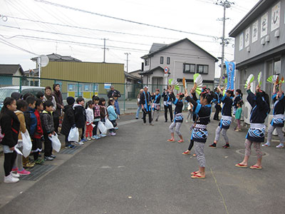 南蒲生雀乃舞の皆さんによる雀踊りで華やかに始まったもちつき会。ぺったん、ぺったんと杵と臼で餅つき体験をして、お雑煮・醤油もち・きなこもちを食べました。今年は地域の幼児親子から老人会の皆さん計150人での楽しいもちつき会になりました。
