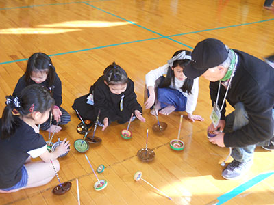 「わらべ村」さんは、八本松地区をはじめ、近くの小学校や児童館などで、昔あそびを子どもたちに伝承する活動をしているボランティアサークルです。この日は14名のメンバーが児童館においでになり、お手玉・ゴムとび・羽根つき・小倉百人一首・福笑い・紙ふうせん・的あて・こまなど、たくさんの昔あそびを持ってきて、一緒に遊んでくださいました。子どもたちは普段接することのできない珍しい遊びに挑戦し、楽しそうにわらべ村のみなさんと交流を深めたひとときでした。