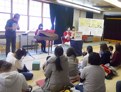 真剣に聞き入っている方や全身でリズムを取っている方、なんと気持ちよくなって眠ってしまう子もいた程、皆音楽の世界に入り込んでいました。紙芝居を使った音楽付きお話は、皆で歌い、とても盛り上がりました。