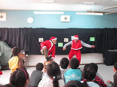 「鳥屋」さんによる創作劇公演と劇ごっこワークショップがありました。2月なのにサンタさんという意表をついた登場で子ども達の心を掴み、子供達の反応をひろって掛け合いながら展開していったので、後ろの方に座っていた子供も途中から全員前にきて夢中になっていました。代表の白鳥さんはコール&レスポンスがしっかりしていれば何気ないやり取りも芝居の1シーンになるという思いを大切に、ここ5年位来て下さっています。そのスピリットが子供達に受け継がれており、今回のワークショップでも絶妙な寸劇が出来上がっていました。表現活動を通してしっかり自分を受けとめてもらって、観て参加して大喜びの子供達でした。