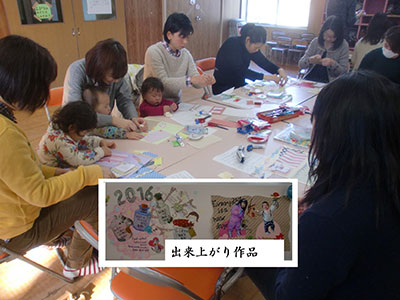 「子育て支援クラブキラキラ」さんとの共催事業として行いました。スクラップブッキングを参考にして、写真入りカレンダーを作ります。写真は、お気に入りのお子さんの写真がほとんどです。かわいい台紙やシールを使って、オリジナル作品が出来上がりました。「久しぶりに熱中して作れた。」「子どもと一緒に楽しめた。」「また作りものをしたい。」等の感想をいただきました。子育て支援クラブの行事は、希望者が多くいつも大盛況です。あなたも将監児童館子育て支援クラブキラキラに入って一緒に活動してみませんか?