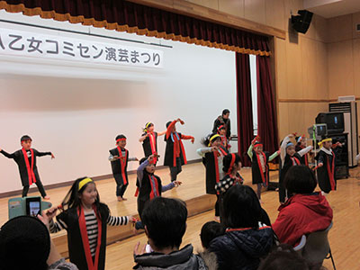 地域の皆さんが踊りや歌等を披露するこのお祭りに、八乙女児童館の「あついぜ!元気なよさこいチーム」が出演させていただきました。最初に、「よっちょれ」という踊りを発表しました。11月から練習してきたので、踊りもかけ声も元気いっぱい、堂々の演舞を披露してくれました。2つ目は「乱舞」という踊りでした。この踊りを、八乙女中学校総合伝統文化部の生徒の皆さんと共演し、先輩の迫力ある演舞を間近で見ながら踊ることができました。お客さんも手拍子やかけ声で応援してくださり、会場全体が大いに盛り上がりました。子ども達は、たくさんの地域の方の前で発表できたせいか、とても満足そうな表情をしていたのが印象的でした。