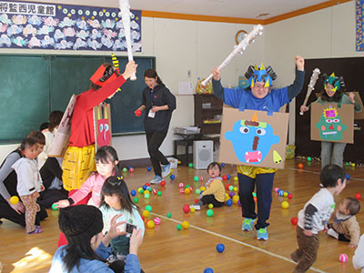 幼児クラブとぜろ&わんちゃんず合同の「まめまき会」を行いました。乳幼児親子28名が参加して、「オニの福笑い」や「まめとり遊び」、「オニのまとあて」などをして楽しく「まめまき会」をしました。子どもたちは、「オニは、そと、 福は内うち」と大きな声で言いながら、児童館職員がふんしたオニに向かって丸めた新聞紙をぶつけてオニをやっつけました。そのあと、オニたちが「ごめんなさい」をして、子どもたちとなかよしになりました。オニを許してあげたご褒美に、福の神からプレゼントをもらい子どもたちは大喜びでした。