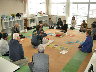消防士の方より、DVD等を使ってわかりやすく説明していただきました。また、救急救命法講習会に参加された方々からの質問にも、丁寧に説明していただきました。人形やAEDを使った実技では、一人一人のいい動きを教えていただき、終始和やかな雰囲気のなかで講習会を終えることが出来ました。