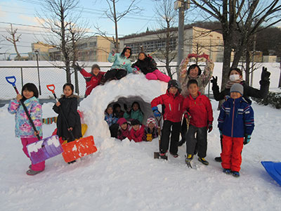 さて、児童センターの子どもたちは学校から帰るとすぐに宿題を終え、外に出て雪遊びを始めます。園庭では積もった雪をいっぱい集めて大きなかまくらを作りました。公園ではそりに乗った子どもたちが勢いをつけてすべったり転がってみたりと思い思いに雪とたわむれています。