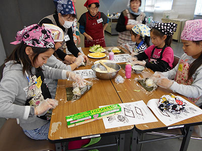 2016/01/23沖野老人福祉センターと共催して、老人福祉センター利用者と児童館利用の小学生を対象にしたクッキングを開催しました。メニューは、今流行の「おにぎらず&白玉だんご」です。グループごとに協力しておにぎらずの具になる卵を焼いたり、包丁を使ったり、だんごを丸めてゆでたりと大忙し!初めての体験にドキドキしましたが、地域の方に優しく教えていただきながら楽しくお料理できました。具がたっぷり入った新しいごはん料理は、出来栄え上々!また、あんこやしょうゆあんがたっぷりかけてあるだんごの味も最高でした。地域の方との話もはずみ、笑顔にあふれ、心も体も満腹のひとときになりました。ごちそうさまでした。