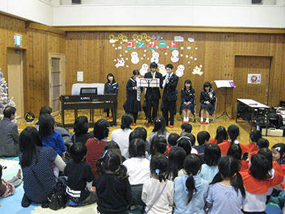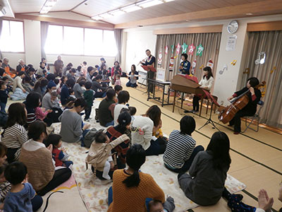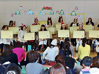 ディズニーソングの「小さな世界」の演奏でスタートです。次の「クリスマスソングメドレー」では、乳幼児ひとりひとりがすずをもって演奏に参加です。みんなで歌いながら、音楽に乗って体を動かしたり、元気よくすずを鳴らしたり、会場全体が一体となり盛り上がりました。その後、「あわてんぼうのサンタクロース」、「さんぽ」と演奏が続きました。「となりのトトロ」の曲で演奏会が終了しました。