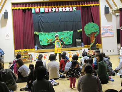 子育て支援クラブ「一期一会」との共催で幼児クラブ(2・3歳児親子)、ポッキークラブ(1歳児親子)、パピプペパーク(自由参加)合同のおたのしみ会を行いました。支援クラブ会長さんの挨拶で賑やかにスタート。はじめは、人形劇サークル「ドリーム」さんによる人形劇を見ました。子ども達が大好きな「ぐりとぐら」、「そらまめくんのベッド」の演目に、目を輝かせて見る子ども達の姿が印象的でした。最後に、トナカイさんと一緒にサンタさんが登場すると、大歓声が沸きあがりました。サンタさんからのプレゼントを受け取ると、親子で満面の笑みを浮かべていて、楽しい時間を過ごすことができました。