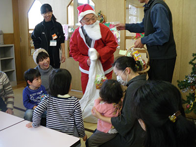 最後に、児童センターのサンタクロースから、参加してくれた乳幼児一人一人にプレゼントが配られました。