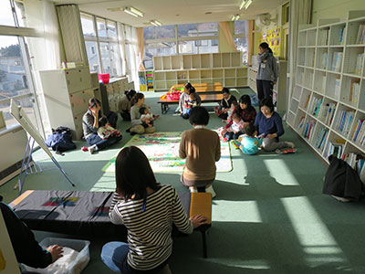毎週水曜日10時30分から行っているわんぱくデー。この日はクリスマス会。郵送のクリスマス招待カードを見て、20組の親子が集まりました。クリスマスがテーマの手遊びや、「あわてんぼうのサンタクロース」のブラックライトシアターで雰囲気満点になったところでサンタクロースが登場!日本語の勉強をして来たとのこと。片言の日本語で子どもたちに話しかけてくれました。子どもたちは少し緊張しながらも嬉しそうにプレゼントをもらっていました。大きなクリスマスツリーのある部屋で、サンタさんにもらった美味しいお菓子を食べながら、お友だち同士楽しい時間を過ごしました。
