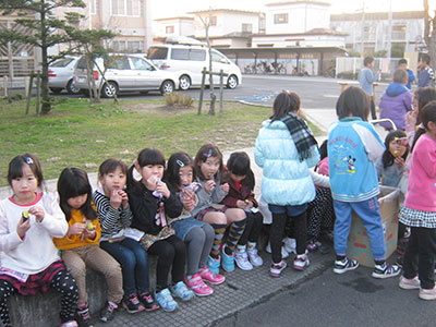 30分ほどで香ばしい焼き芋が完成!縁石に並んで座って熱々の焼き芋をふうふう冷ましながらみんなで食べました。風邪は冷たくてもお腹と心はぽっかぽか♪ほっぺを赤くしながらみんな「おいしーい!」と大喜びでした。