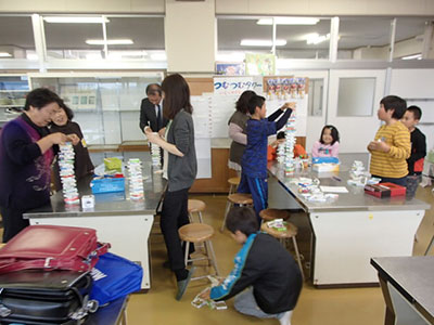 遊びコーナーは〝つむつむタワー″。(牛乳パックを輪切りしたものを積み重ねる遊びです。)友だちや自分の記録と競いながら小学生はだんだん夢中になっていきました。いつのまにか見ていた大人の方がはまってしまう場面もありました。