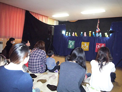幼児クラブ・定例行事ハッピーかばたん合同の活動として「人形劇」を鑑賞しました。当日は、人形劇サークル「ぐうちょきぱぁ」の方々をお招きし、手遊び、折り紙指人形のプレゼントに続き、人形劇「冬の運動会」の公演を鑑賞しました。可愛らしい動物たちが、綱引きや玉入れ等色々な競技に奮闘する様子を見た子ども達からは、掛け声や歓声があがり、親子で楽しいひとときを過ごしている様子がみられました。