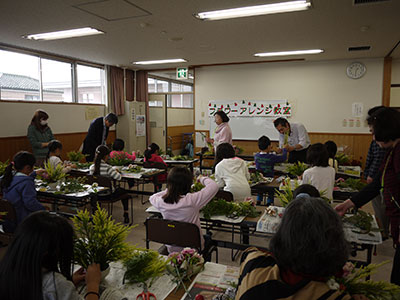 宮城県花と緑普及促進協議会の助成をを受け、小学生向けの花育教室を実施しました。作るのは、クリスマスをテーマにしたフラワーアレンジ。用意された真っ赤なバラやカーネーション、松ぼっくりや姫りんごなど沢山の花材を前に、始めは戸惑う子どもたちでしたが、講師の山口先生の簡単なアドバイスと「自由に作ってくださいね」の言葉に、みんな真剣な表情で取り組みました。また、地域から参加の大人の方と、児童福祉協議会の皆さんのお手伝いをいただき、出来上がった作品は…どれも素晴らしい作品で、先生も大絶賛☆子どもたちも大満足の様子。お花をお部屋に飾り、クリスマスまでのカウントダウンに胸踊らせる子どもたちなのでした♪
