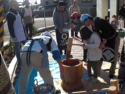 向陽台児童館の恒例行事「もちつき会」は今年も大盛況!館内は早朝からお蒸かしや雑煮の香りがただよい餅つき気分が高まります。最近見ることが減った杵と臼を使っての餅つきを幼児から中学生まで参加者全員が体験。重たい杵を持ってつくたびに周りから「ヨイショ」と掛け声をかけてもらいました。白蒸かしを食べ、鏡餅にまつわる話、箸袋の工作をして日本の伝統文化を学びました。その後は子育て支援クラブさんが作ってくれたあんこ餅、のりしょうゆ餅、お雑煮を堪能。参加者のにこやかな表情からその美味しさが伝わってきました。今年は青空の下、地域の方々に見守られながら一足早いお正月気分を味わいました。