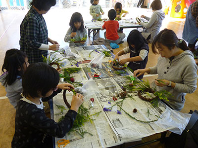今年も地域の「お花の会」の方々を講師に迎え、クリスマスリースづくりを行いました。今回の参加者は、常連、初めての人そして親子での顔ぶれでした。講師の方が、雪冠杉・山帰来・姫りんごなどの由来をお話ししながら、その他の松ぼっくりや綿などといった季節にちなんだ花材を土台のリースに差し込み、最後はクリスマスカラーのリボンを結びつけて完成となりました。当日は、子育て支援クラブさんにもお手伝いしていただき、ひとりひとり個性あふれる作品ができました。季節のお花や自然物にふれながら、自由に表現する貴重な体験となりました。
