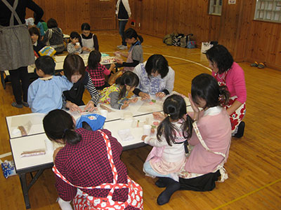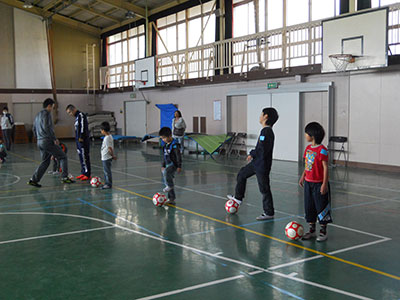2015/11/28フットサルプロチーム「ヴォスクオーレ(Voscuore)仙台」のメンバーをお呼びして、「フットサルにちょうせん!」という行事を行いました。太白小学校の体育館を借り、幼児さん1人、小学生11人、大人2人が実際に指導を受けました。見学は10人でした。