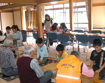 2015/10/28児童館近くの老人憩いの家にお邪魔し、将棋クラブの皆さんの胸をお借りして将棋にチャレンジしました。脚付き将棋盤・駒台を目の前に座布団に座り、その格好はプロ棋士その物…将棋の駒の動かし方は知っているけど攻め方、守り方はやはり皆さんには敵わない。一手の重みや、相手との駆け引きの仕方を優しく丁寧に教えていただきながら、将棋の楽しさを十分に堪能した子どもたちでした。毎年開催しているので、高学年の参加もあり、低学年の子ども達は高学年との対戦にも一喜一憂し観戦していました。将棋クラブの皆さんに、「また、来いよ」「待っているね」と声を掛けていただきとても嬉しそうでした。感謝です。来年も挑戦します!
