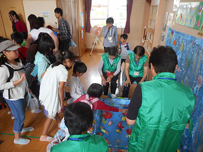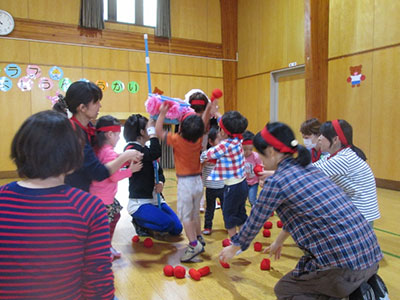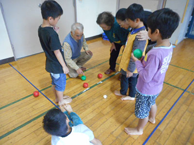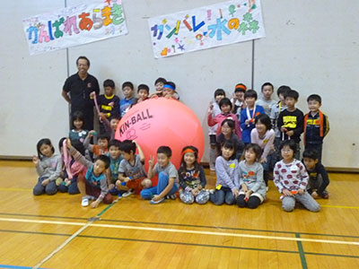 2015/10/13秋休みの一日、毎年恒例の荒巻マイスクール児童館とのA&Mキンボール交流会が開催されました。当日は荒巻マイスクール児童館から16名ものお友達がやってきてくれました。チームごと色分けされたはちまきをまいたら、講師の東仙台小学校の只野先生と楽しく準備運動です。そして、いよいよキンボールの登場!普段は見たこともない大きなキンボールにみんな大興奮!!仰向けに寝てお腹の上に乗せたり、2人組で転がしたら、試合開始です。取りやすいように相手のいる方に投げてあげる優しいチーム、みんなで力を合わせてキャッチしたチーム、それぞれの個性を発揮し、みんなで協力し合ったキンボール交流会でした。