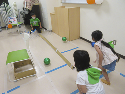 宝さがし、さかなつり、糸引きくじ、とうもろこしマラカス、工作、迷路、ボーリング、ボールプールの全部で8個のコーナーを浴衣や甚平を着た乳幼児が時間の許す限り楽しんでいきました。