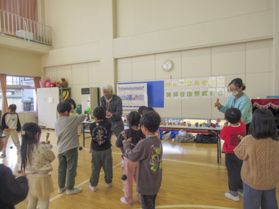 2025/11/27今回のたっぴいタイム1・2・3は、音楽あそびグループ「おんぷっパ♪」さんをお招きし、音楽に合わせて体を動かしたり、楽器を使ったりして、楽しい時間を過ごしました。
