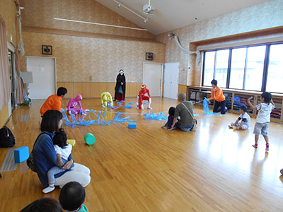 2015/10/01芸術飛行船の協力の下、「プチレディここあのマジックショー」が開催されました。子ども達も心待ちにしていたようで一週間も前から「いつやるの?」と聞いたり、自分でマジックをあみだしている子もいました。当日は90人もの子ども達が集まり、間近で見られるトランプマジックなどに大興奮!「マジックのお手伝いをしてくれる人いますか?」の言葉にたくさんの手が上がりました。質問タイムでは「山上兄弟と掛け声が似ていますがどうしてですか?」の質問に「山上兄弟の妹分でいつも後ろでアシスタントをしているからです。」の答えでみんながどよめきました。