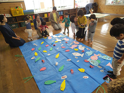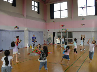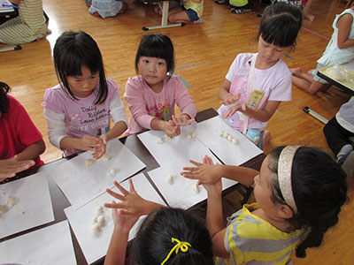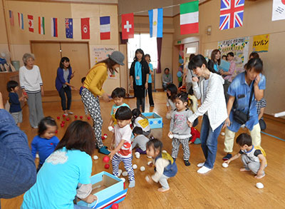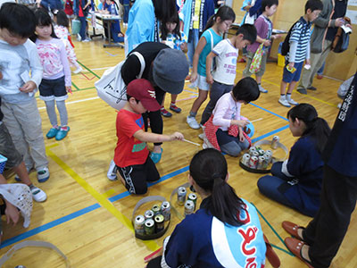 2015/09/189月18日「木町通小学校PTA花火祭り」が開催された。花火打ち上げに先立って30の出店が体育館で4時に一斉スタート、児童館・市民センター共催の「わりばしダーツ・あきかんつりコーナー」も仲間入りした。釣竿で空き缶を1分以内で釣り上げたり、10本の割り箸を次々とペットボトルの口めがけて落としたりして記録に挑戦した。高得点が出る度に大学生ボランティアが鳴り物入り喝采で応え、そうでない時も優しい笑顔をおくっていた。そのため、用意した景品がすぐになくなったにもかかわらず、子ども達の並ぶ列は途切れることがなかった。こうして、400名以上の参加者と20名のスタッフによるゲームコーナーの2時間は、楽しいひとときとなった。