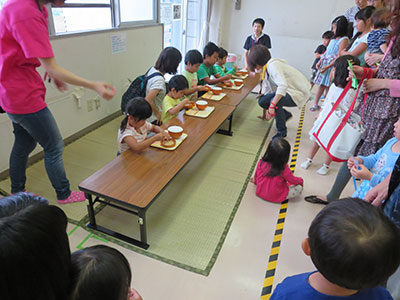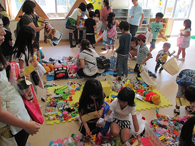 2015/09/12今年で2年目開催になる「とり+かえっこ」。天気に恵まれ、開始前にはおもちゃを抱えた子供たちで行列が出来るほど。幼児から大人まで80名の参加がありました。銀行、問屋、レジなどのお仕事を子供スタッフが中心になり進めます。お仕事、または遊びのコーナーで「かえるポイント」を貯めて好きなおもちゃと交換します。想像したよりお仕事の大変さを感じた子も多かったようです。ドキドキのオークションでは、激しい競り落とし合戦が繰り広げられる場面もありました。最後は「楽しかった!」「来年はスタッフやりたい!」と笑顔で話してくれる子もいました。子供たちが主体的に動くことが出来る所が「とり+かえっこ」の魅力だと思います。