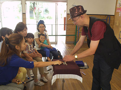 在仙マジシャンのタティーさんによるマジックライブが、託児付きで行われました。トランプやお札を使った「テーブルマジック」が目の前で繰り広げられ、ママたちは「こんなに近くで見ているのに全然わからない!」と目を丸くしていました。タティーさんの不思議な魔法に、別室にいた子どもたちも引き寄せられて、気がつくといつしかママのそばでじっと見入ってました。