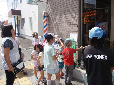 9月に入っても残暑がきびしい晴天の土曜日、小学生8名が子育て支援クラブの皆さんと一緒に地域探検に行きました。今回の目的は、児童館周辺のこども110番のお店を知ること。9件のお店を一軒ずつ訪ね、ご挨拶をしたりお店の中にお邪魔したりして交流をしました。「こども110番のお店は危険な目に遭遇した時だけでなく、何か困ったことがあったらいつでも声をかけていいからね」と教えてもらった子ども達は、驚きと共にとてもホッとした様子。優しい地域の方々に見守られていることを実感することができました。快く協力してくださったこども110番のお店の方々、ありがとうございました。そして地域の皆様、これからもよろしくお願いいたします。