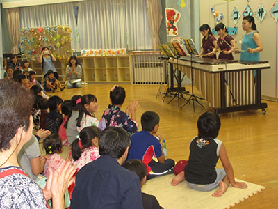 普段なかなか聴く機会のないマリンバの音色は、時にかわいらしく、時に激しく、時に優しく響き渡り、そこにいた人も部屋も空気も全て音に包まれるようでした。コンサートのラストを締めくくるのは、これも恒例になった「ビリーブ」。マリンバの演奏にみんなの声も優しく重なり、温かい気持ちが児童館中にあふれていました。かざぐるまと水ヨーヨーを手に、参加してくださった人達はみんないい笑顔で家路につきました。