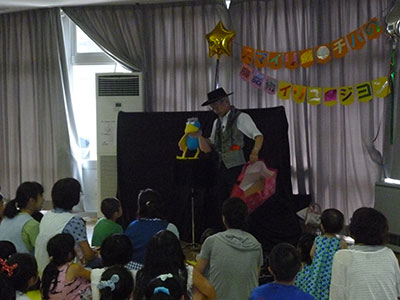 真夏の児童館にやってきた、スマイリー・チバの腹話術イリュージョン!エアコンの効いた涼しい遊戯室で、普段は歯医者さんとしても活躍しているスマイリー・チバの腹話術を楽しみました。