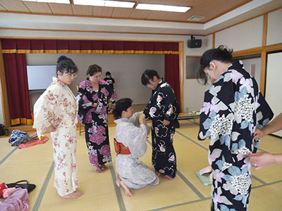 腰紐やベルトの効果的な使い方や着くずれしない方法を教えていただき、帯も自分で締め、浴衣美人のできあがり。今回は小学生とお母さん方5名の参加で、予定人数よりは少なかったのですが、その分一人一人丁寧にみていただけました。最後に教わった着物のたたみ方に、意外と知らない人が多かったので皆なるほど!と納得していました。
