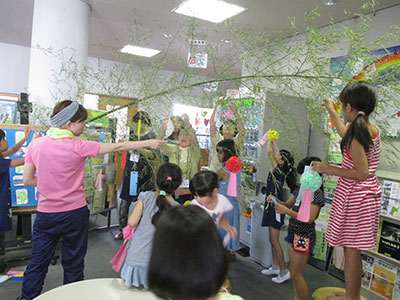 祭りの当日、みんなで作った大きな七夕飾りが、会場に彩りを添えました。