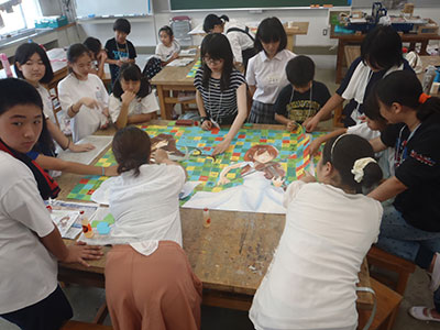 今年も宮城県宮城野高等学校美術科の生徒と仙台市立田子中学校美術部の生徒、そして田子児童館の子ども達と一緒に共同画を制作しました。今回で3年目となる共同画は児童館の子たちがタイトル(テーマ)を決めて、中学生が原画を作成。高校生たちが実際の共同画の作り方をみんなに指導してくれました。