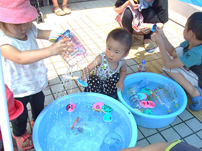 手作りの水遊びグッズを使って、小学生と乳幼児さんの夏休みの交流会が行われました。発砲シートで作った浮き絵に、ペットボトルで作ったシャワーと水鉄砲。「小さい子が喜ぶように、可愛い絵を描かないとね~」と話しながら、準備を進めてきた小学生たち。ペットボトルに水を入れてあげたり、しゃぼん玉を作って見せたりと、がんばる小学生。しかし、時間が経つにつれて…あれれ~やっぱり自分たちも遊びだしちゃった!あちこちでダイナミックな水かけが始まりました。微笑ましく見守ってくださったお母さんたちに感謝です。最後は児童福祉協議会さんからいただいた、大きなスイカをみんなで食べました。「また遊ぼうね!」と手を振る姿が見られる、楽しい交流会でした。