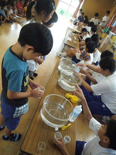 夏休みのスペシャル企画。昨年好評だった、蒲町中学校科学クラブの皆さんの協力による「実験!科学クラブ」の第二弾。今年は、スライム作りです。大人気の行事で、たくさんの申し込みがありました。