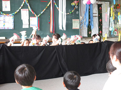 『パペットシアターみにぶんぶん』さんによる人形劇「鬼と5」を観て、その後で希望者が「1匹の野ねずみ」の歌に合わせてハンドパペットを動かす人形劇体験をしました。みにぶんぶんさんの魅惑のステージにすっかり魅了された子ども達でした。人形劇体験では、やってみたい小学生が手を挙げ、みにぶんぶんさんから人形の動かし方や出し方を教えてもらい、他の小学生の前で披露しました。即興とは思えないかわいらしい人形たちの動きに大きな拍手がおこりました。演じた小学生たちも「楽しかった」とにっこり。人形で演じる楽しさに触れた子ども達、今後「人形劇やってみ隊」として人来田まつりで発表する予定です。