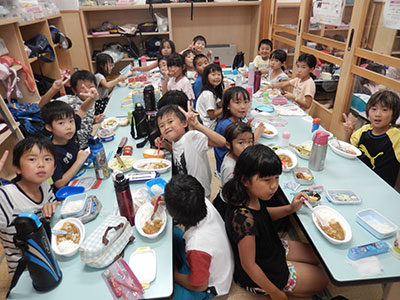 夏休みを迎えた児童クラブの子供たち(約80名)は、八幡児童館恒例の「カレーパーティー」で、楽しい1日を過ごしました。