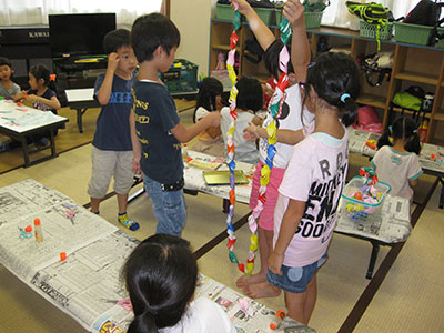 2015/07/23宮町商店街の七夕に出展する飾りを21日から25日までみんなで作りました。テーマは「みんな笑顔」です。作った人も、飾りを見た人も笑顔になれるといいな~の思いを込めて。この日は画用紙にニコニコ笑顔を描いたり、貝つなぎや輪つなぎを作ったりしました。どんどんつなげた長い長い貝つなぎに満足そうな子どもたち。願い事もかなうといいな。