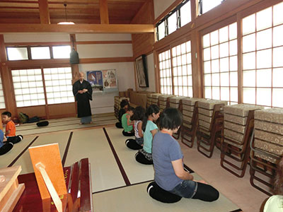 座禅は背すじをピンと伸ばし、呼吸を整え落ち着いた静かな心になることです。今回の行事「みんなで座禅」は、長泉寺さんのご協力のもと、小学生から一般の方まで14名の参加で行われました。みなさん緊張した顔でその時を待っていました。さあ座禅の始まりです!セミの声以外何も聞こえない静寂の中、住職さんの足音だけが響いています。普段元気な小学生たちも、長い長い35分間を一言も話さずじっと座ったまま頑張ることができました。終わったとたん、「あ~疲れた」が第一声でした。暑くて長い夏休みを乗り切るために、始まりの日にふさわしい行事となりました。