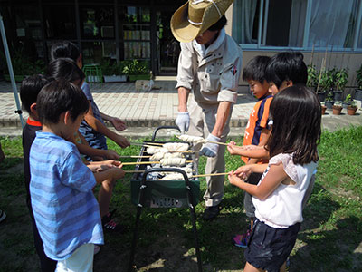 夏休みに入って二日目。児童クラブの子どもたちと館庭で、「スネークパン」を作りました。小麦粉のパン生地を細くヘビのように伸ばし、ウインナーをさした竹の棒にぐるぐると巻いて下準備完了。みんな、顔や服に小麦粉がついて、真っ白でした。ここから、暑い暑い館庭で、熱い熱いバーベキューコンロの上にパンをのせ、転がしながら、焼いていきます。「あっつう〜!」と今度は真っ赤な顔で、汗をかきながら、頑張って焼きました。いい色の焦げ目がついて、やっと食べることができました。「おいしかった!」と、苦労して作ったパンの味は、格別だったことでしょう