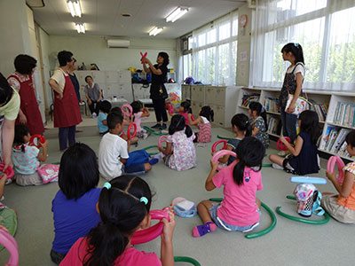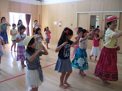 夏休みの暑い中、地域の民生児童委員であり、子育て支援クラブの会員でもある大坂富美子さんを講師に迎えて、フラダンス体験を行いました。参加した子ども達は、花柄のスカートや麦わら帽子を持参するなど、準備万端、意欲的に活動に参加しました。ほとんどの子どもはフラダンス初体験でしたが、ハワイアンのゆったりした音楽に合わせて、曲のイメージをふくらませながら、楽しそうに体を動かす姿が見られました。最後に、花の髪飾りをみんなでつけて踊りました。南国気分に浸りながらの、楽しい体験でした。