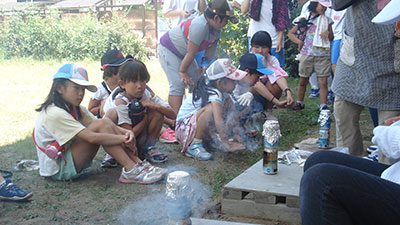 「サバイバルとは災害、戦争などの悪条件の中で生き残ること」と館長先生の話の後でアルミ缶と“あの”牛乳パックでご飯を炊きました。火を絶やさない様に気をつけて、うちわであおいで…。蒸らす間にサバイバル○×クイズ。ボランティアの中学生も小学生に負けじと手を挙げ答えます。楽しく時間を過ごしているとご飯の完成。大なべで作っておいたカレーをかけて食べたお昼のおいしかった事。おかわりが止まりませんでした。