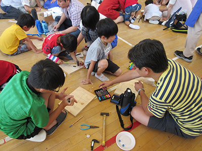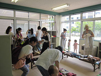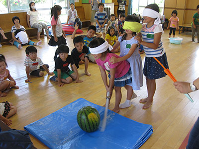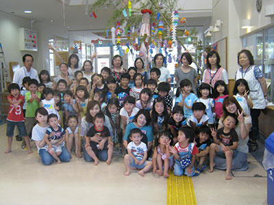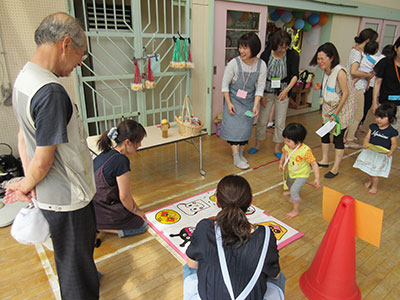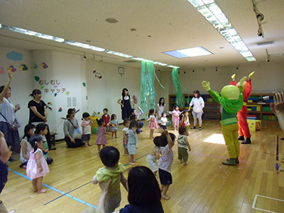 2015/07/15この日は朝から快晴で、絶好のしゃぼん玉日和でした。すぐにでも始めたいくらいでしたが、まずは室内でわらべうたや体操、水遊び工作を楽しみました。