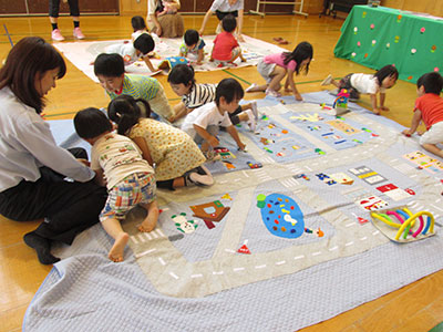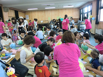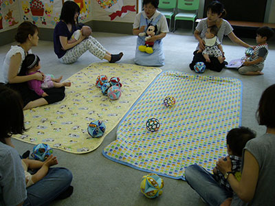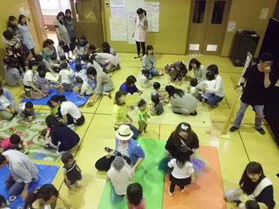 若林区の子育て支援ボランティア組織「輪っ!かばやし子育て応援団」による年1度のお祭り「親子ふれあい広場」が、若林区中央児童館を会場に開催されました。区内の児童館、保育所、幼稚園、自主育児サークル、個人ボランティア等のスタッフ55名が、区内の乳幼児親子に楽しい場を提供しようと、10コーナーのブースを設け、また新たにママカフェを開催するなどしてお祭りを盛り上げました。今年は、昨年より100名近く多い300名程の皆さんに参加していただきました。区内の子育て支援の層の厚さを感じさせられる行事になりました。