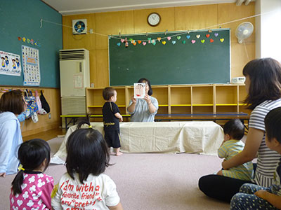 その後、パネルシアター「しゃぼん玉」をみて、あかちゃんにとっては初めてのしゃぼん玉を体験しました。あかちゃんも興味深くじっとみつめ、お母さん達もそれに応えて、楽しそうに話し掛けていました。