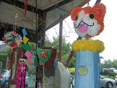 6月29日から3日間、季節の行事として七夕ウイークを行いました。地域の方に立派な黒笹をいただき、玄関ホールに伝統の七つ飾りを飾り付けました。短冊には思い思いに願い事を書き、笹にくくり付けました。七夕ウイークで計画していたメインの「くす玉」飾りのモチーフは子どもたちの人気の妖怪ウォッチのキャラクターにしました。製作前から子どもたちもワクワクした表情で、お花き・鎖つなぎ・吹き流しにつける飾りの塗り絵、どれも普段作った事のないもので、それぞれの活動をとても楽しんでいる様子でした。3日かけて出来上がったくす玉は、作った子どもたちはもちろん、地域の方々にも大変喜んでいただきました。